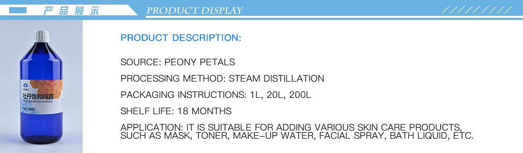 Pure dew from the plant itself the effect of mining, based on aromatic therapy or the purpose of skin care, after the condensate byproduct in the process of steam or water distillation plants in the process of distillation, can produce oil-water separation, oil floating on the surface of the aqueous solution, and the aqueous solution is pure dew peony pure dew main ingredients: alcohol alkanes esters, ketones and aromatic hydrocarbons and their derivatives, also contains a small amount of aldehyde pyran alkene and phenol, etc.; Their hair ingredients mainly benzene ethanol and linalool oxide of aldehydes and ketones is its significant antioxidant activity in pure dew in addition to contain traces of oil, also contains a lot of water-soluble substances in plant peony petals characteristics were also more likely to let the skin absorb, without adding any chemical composition such as essence, gentle no stimulation.