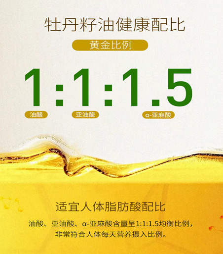 根據《中國居民膳食營養素參考攝入量》DRIs中倡導的膳食脂肪酸均衡攝入。"花之元"牡丹籽純油是上禾資深營養專家精心研制,專為東方人量身定制的一款跨時代營養健康食品,精選優級油用牡丹籽為原料,采用尖端純物理冷榨特制而成,保留了牡丹籽油的純正與天然活性物質且不添加任何仿腐劑,其煙點在240℃至270℃,遠高于其他食用油,可以煎炸反復使用不變質。產品中科學調配飽和脂肪酸、單不飽和脂肪酸與多不飽和脂肪酸,達到2個層次3大類脂肪酸的科學供給,配合膳食,就能幫助人體從膳食中均衡攝入脂肪酸。