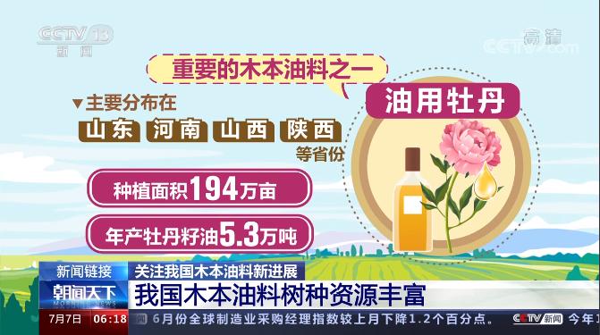 油用牡丹是重要的木本油料之一,主要分布在山東、河南、山西、陜西等省份。種植面積194萬畝,年產牡丹籽油5.3萬噸。