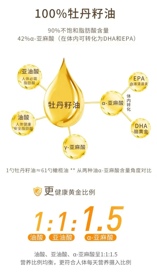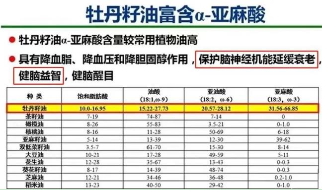 牡丹籽油的α-亞麻酸(屬Ω-3系列)是人體必須脂肪酸,是DHA(腦黃金)、EPA(血管清道夫)的母體,是(嬰幼兒、青少年)腦神經、視神經構成和發育的主體成分,被世界衛生組織(WHO)和聯合國糧食組織譽為“血液營養素,植物腦黃金”。