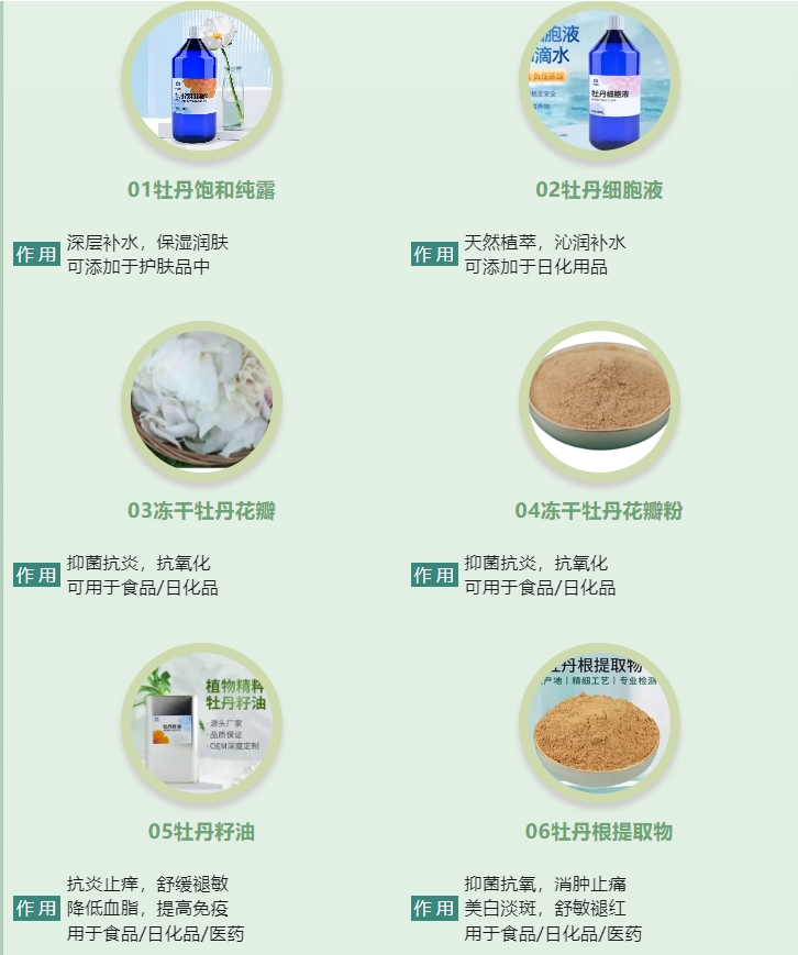 中資國業堅持科技創新,高質量提取牡丹精粹。亞臨界萃取牡丹籽油,古法銅鍋蒸餾牡丹純露,工藝成熟,每種牡丹提取物出廠前都經過權威檢測,并有專業功效檢測報告。