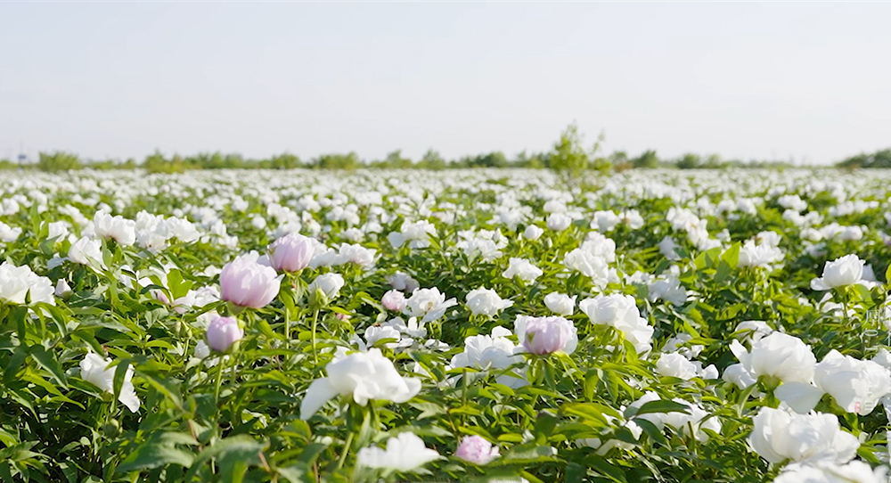潔白如雪,層層疊疊,牡丹花海綿延千里,與遠處青山相映,匯成一幅秀美畫卷。