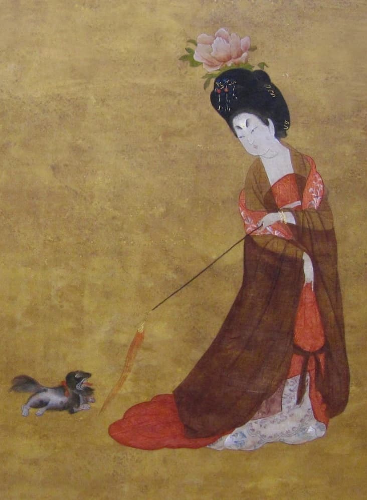 畫中貴族婦女頭上插牡丹花一枝